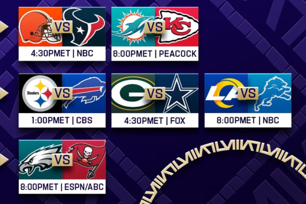 • (3) Kansas City Chiefs vs Miami Dolphins (6) | Sábado 13 de enero a las 19:00 horas (centro de México) en el Arrowhead Stadium de Kansas.